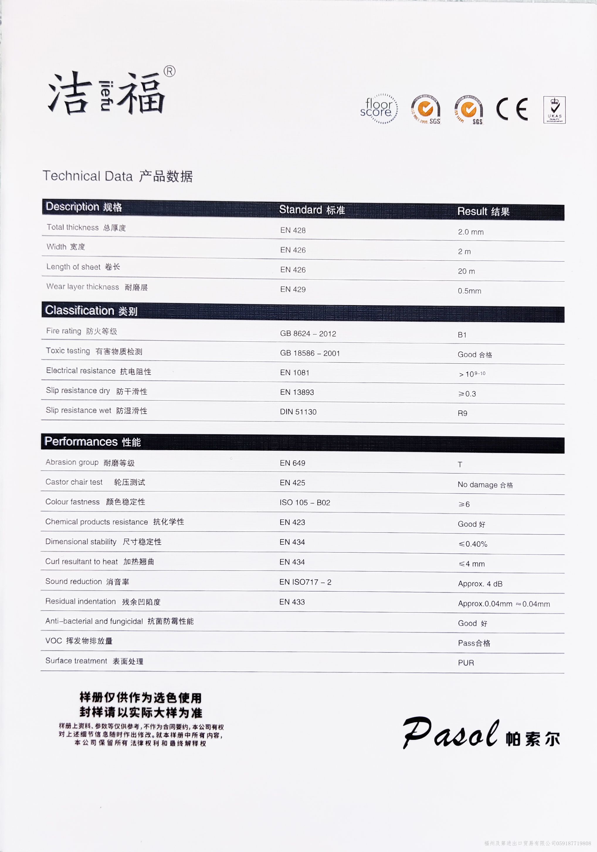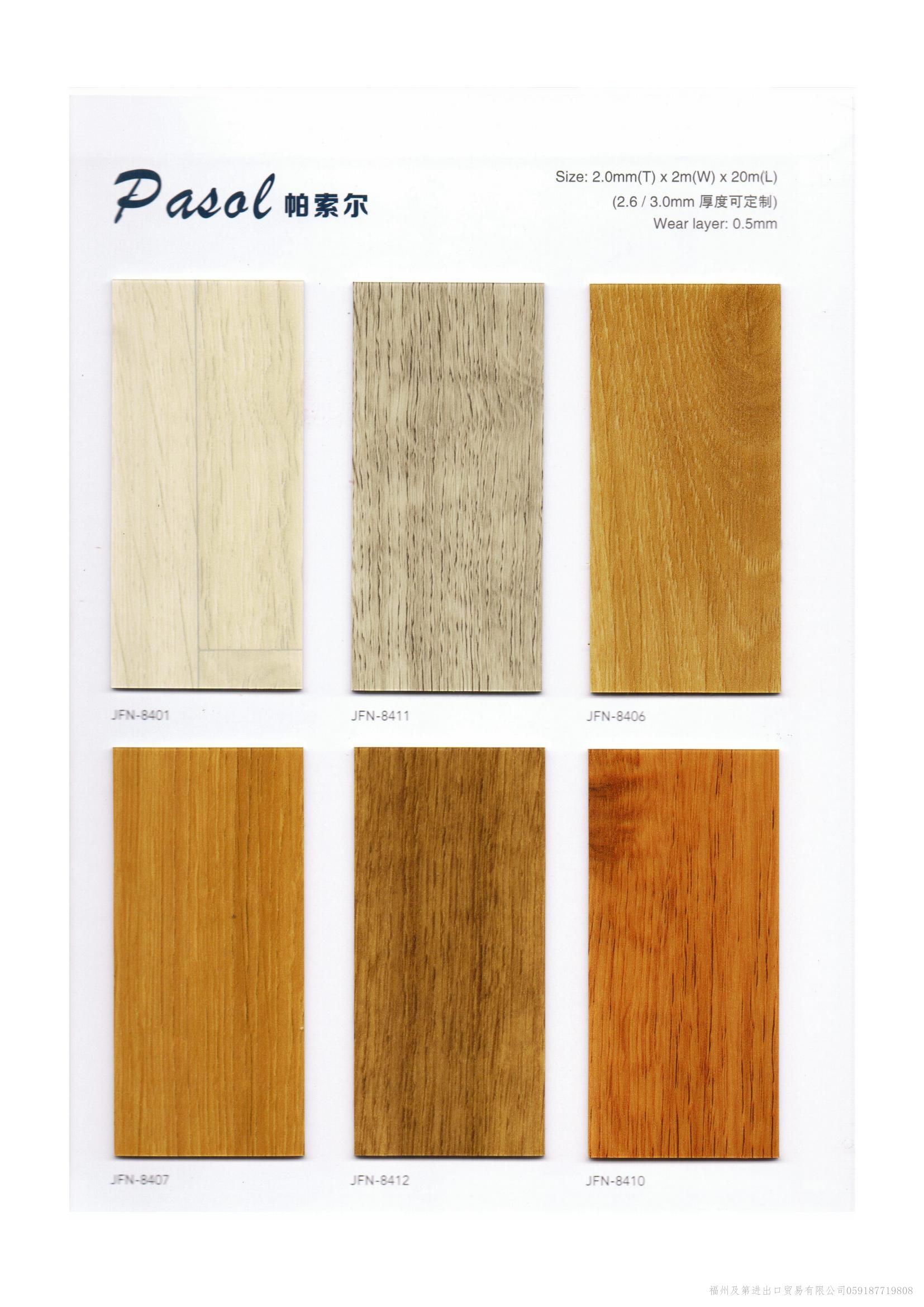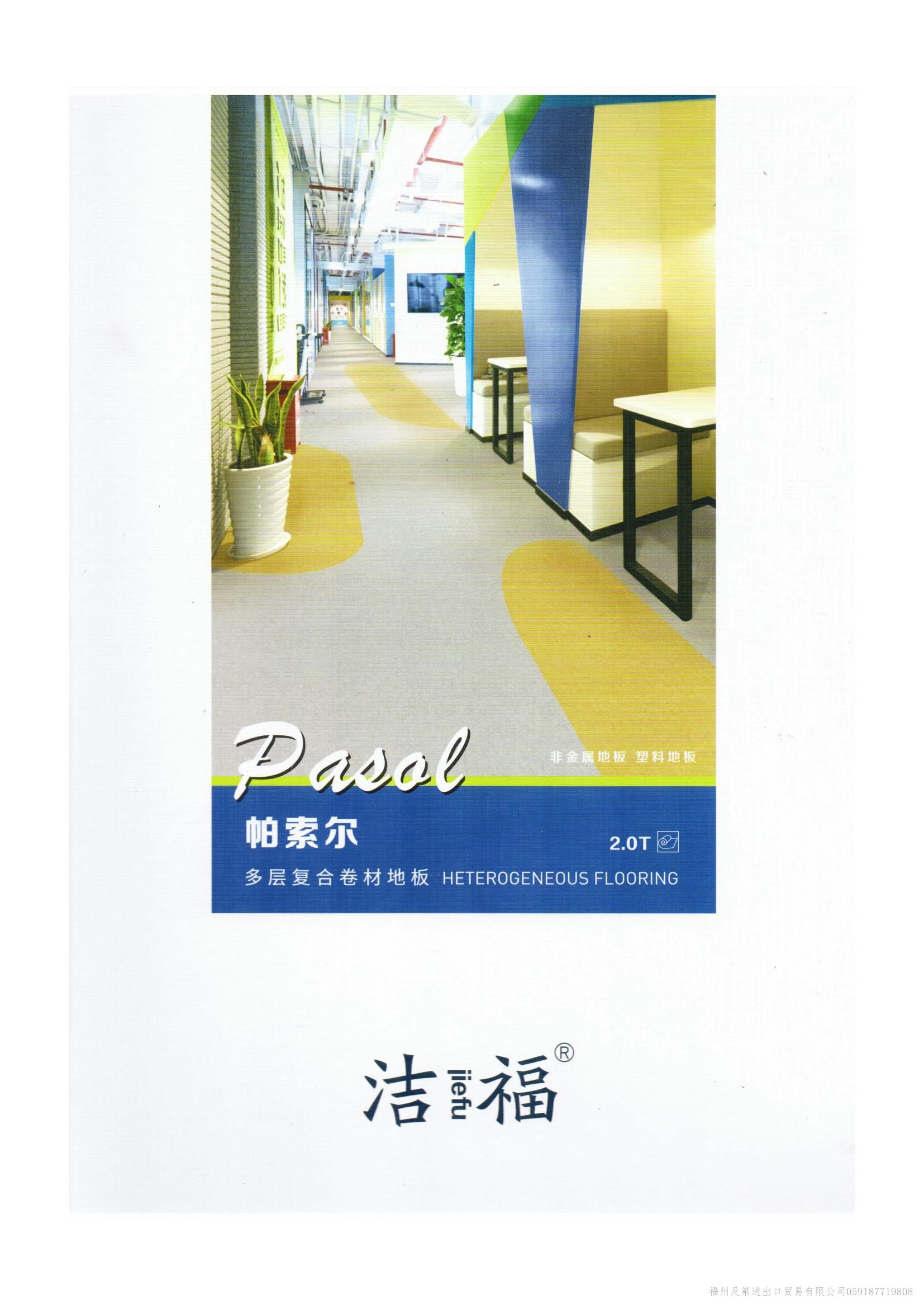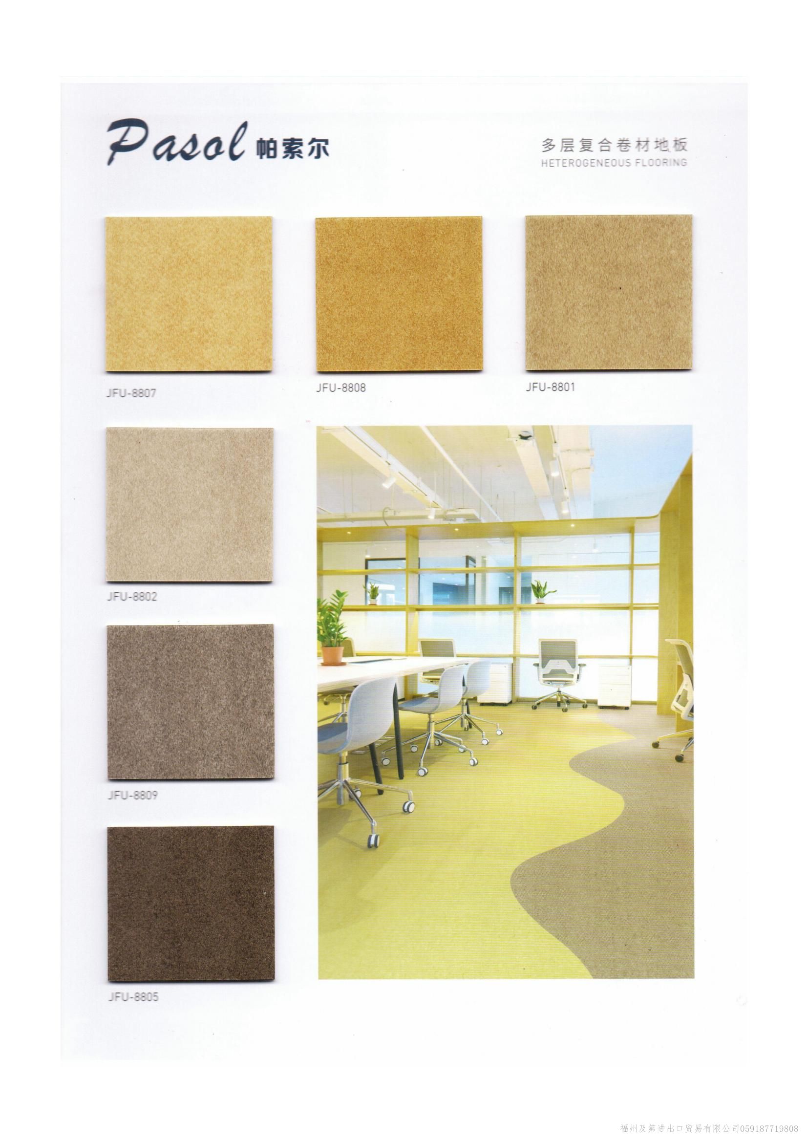 中国洁福JIEFU品牌地板-同质透心地板顾名思义“从表面到底部的花纹一致的地板”整体为单层结构,耐磨系数高,使用年限高于其他多层PVC复合地板。常规库存现货的规格:2.0mm*2.0m*20/卷;花色多样(上百种)可满足各类型的设计需求,支持来样定制加工厂生产:厚度2.5mm/3.0mm等; 我们的产品可涉及的领域包括但不限于:家装,医院,教育,工业,办公,零售,公共场所,交通,运动等。