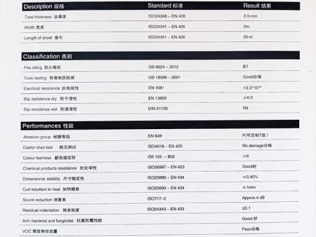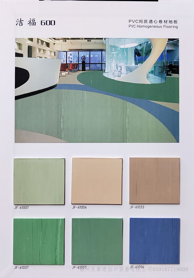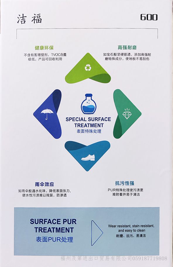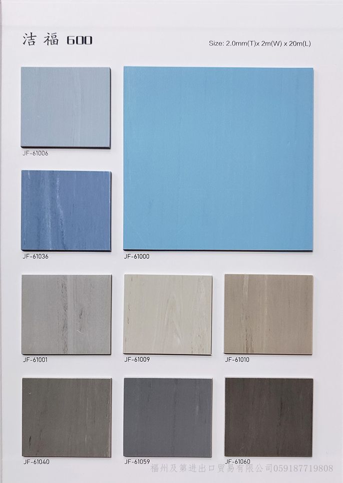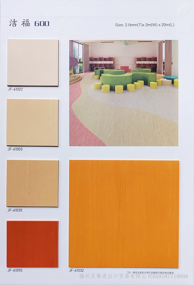 产品特点: -健康环保 不含有害增塑剂,TVOC含量,产品可回收利用 -高强耐磨 如宝石般坚硬剔透,添加高强耐磨特殊成分,使地板不易划伤 -雨伞效应 如雨伞般遇水化珠,降低表面张力,使水性污渍难以残留,防渗透 -抗污性强 表面PUR特殊处理,使污渍难附着易于清理,同时具有表面抗碘酒处理 产品规格: 2.0mm*2m*20m 产品用途: 医疗卫生、教育空间、商业公区、餐饮服务、办公场所等
